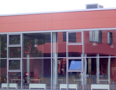 Mensa befinden sich direkt nebeneinander. Die Turnhallen sind auf