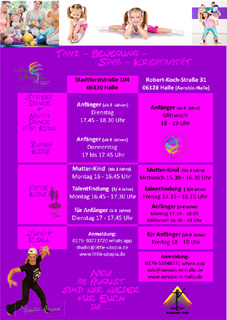 15.30 - 16.30 Uhr Mutter und Kind 1 bis 3 Jahre 16.30 - 18.00 Uhr Fitte Kids 5-8 Jahre 18 - 19 Uhr Street & Happy Dance ab 9 Jahren |